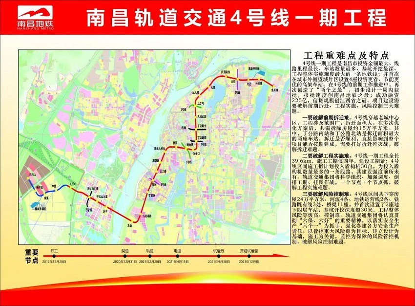 南昌軌道交通4號線是軌道交通線網中的主骨干線路,串聯了城市重點發展區域,覆蓋了贛江東西岸主要發展軸,與先期運營的1、2、3號線多處對接。建成通車后,城市設施更加完備,最大限度地滿足人民群眾快速、便捷出行需要。