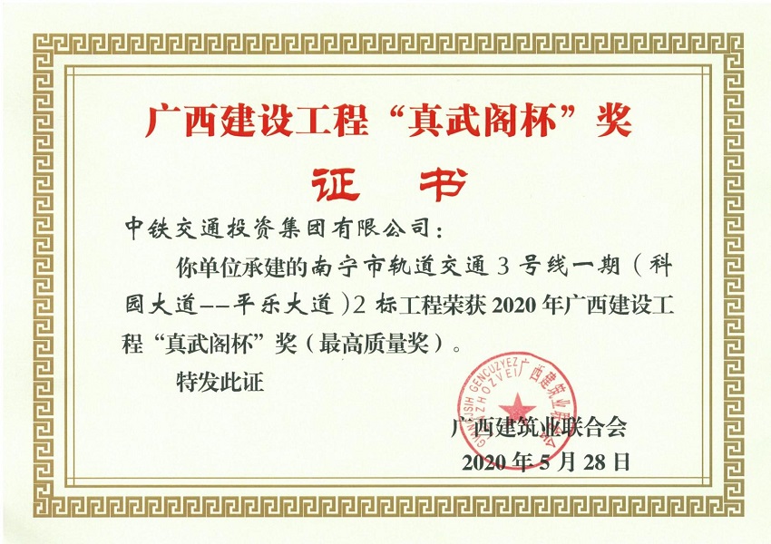 5月28日,廣西建筑業聯合會公布2020年廣西建設工程“真武閣杯”獎(廣西區最高質量獎)工程獲獎名單,中鐵南寧市軌道交通3號線一期工程02標榮獲“真武閣杯”獎。