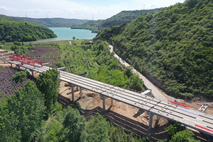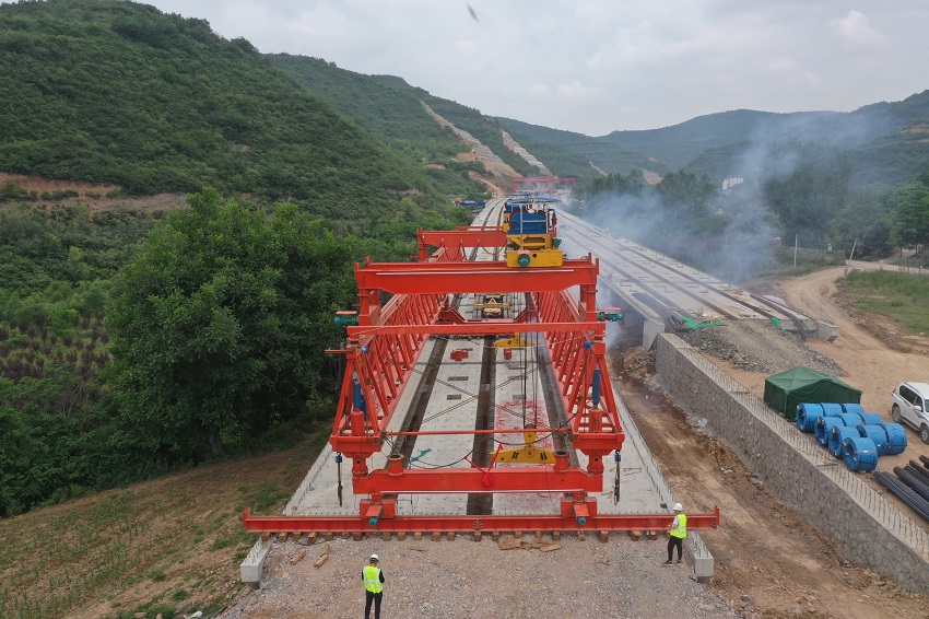 ▲花家河2號(hào)大橋預(yù)制梁架設(shè)
