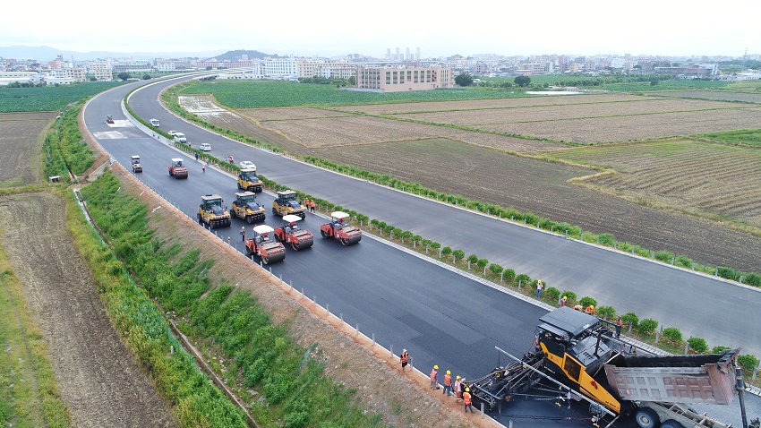 7月8日,汕揭項目第二作業面K27+750-K28+050段瀝青路面上面層試驗段鋪設順利完成。