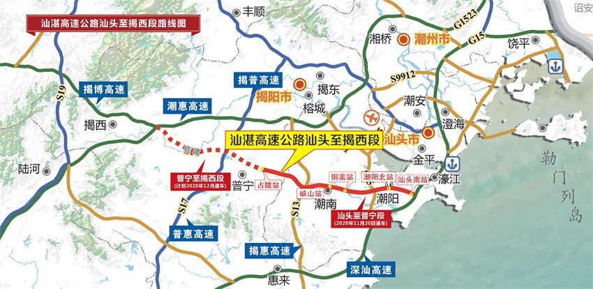 廣東汕湛高速公路汕頭至揭西段是廣東省高速公路網(wǎng)中汕頭至湛江高速公路的起點段,是服務(wù)粵東地區(qū)出行、補齊區(qū)域發(fā)展短板的重要交通工程。開通的廣東汕湛高速公路汕頭至普寧占隴段主線長約49公里(汕頭段全線約43.5公里),包含濱海、潮陽北、銅盂、峽山、占隴5個互通,分別與沈海高速、牛田洋快速通道、潮汕環(huán)線高速、揭惠高速以及河浦大道、省道234公路、省道237公路、北環(huán)大道等實現(xiàn)聯(lián)通,同步開通包括汕頭境內(nèi)的汕頭南、潮陽北、銅盂、峽山收費站和揭陽境內(nèi)的占隴收費站。